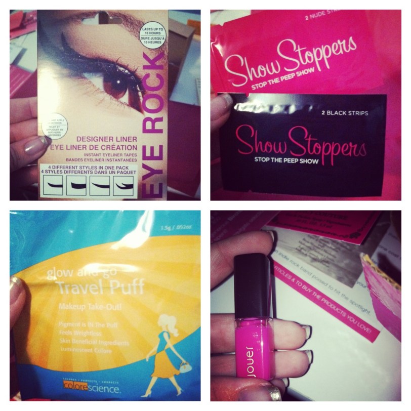 Inside the tissue wrapped bundle tied with the black ribbon contained several goodies. There was two packs of designer fashion tape, Showstoppers, you get a nude pair and a black pair; Colorscience Pro’s glow and go travel puff and a small tube of hot pink lip gloss by Jouer. I am really excited about all of these because I will be traveling to Charleston, South Carolina next month so these are all perfect for chic and fashionable traveling. I’m interested to see how the glow and go travel puffs actually do, the concept is really cool. They claim to be handy, powder-filled puffs that keep your skin shine-free and luminous while you’re out of town. So we shall see how they perform while I’m out of town on business. I am over the moon with the pink gloss by Jouer because I have been looking for a gloss just like this for a while now, and what do you know? The perfect gloss found me. π