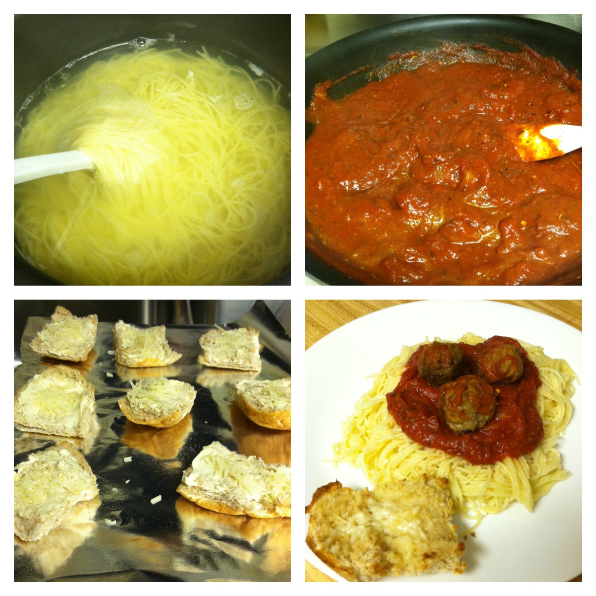 Traditionally, it’s served over penne, but I prefer it over angel hair. If you like you can add the meat of your choice, sometimes I like to use crumbled Italian sausage or meatballs. I also made some wheat garlic bread sprinkled with a little grated parmesan.