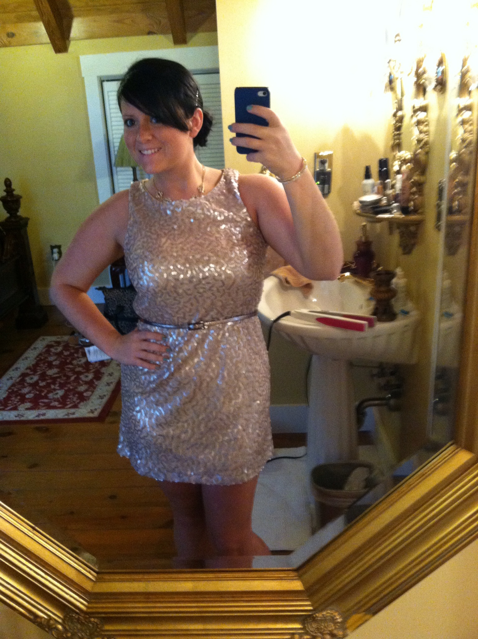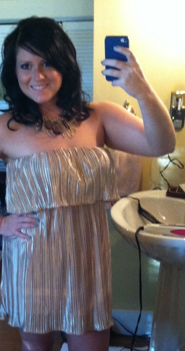 Saturday night was the big Charleston Fashion Week finale and I couldn’t wait to wear my dress that my mom and I made. It happened as a last minute thing, I was out shopping for a finale dress when I found a shirt made of this light flowy gold fabric and instantly fell in love. The shirt was a size 3x and was beyond too big for me, but when I saw it I instantly wanted to turn it into a simple tube dress. So my mom taught me how to sew and we created this dress. It’s nothing spectacular, but I love it and I made it so to me its priceless. Between the dress, my hair and makeup I truly felt like a million bucks before even arriving to the event. Everything just seemed to fall into place, which is always an amazing feeling. After drinking an unnatural amount of water I even managed to squeeze my feet into some heels! I got the most compliments on this dress than any of the others I wore all week, which totally stroked my ego! Here is a standard picture of the dress and an up close photo of my hair and makeup…