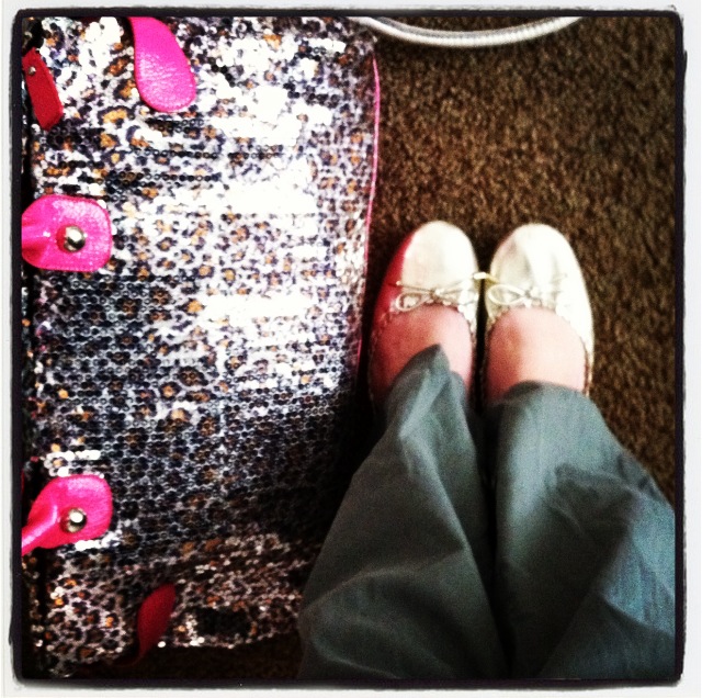 Last night as I was leaving for the night to get some sleep my grandmother asked me if I would do her hair and nails for her today when I came in to see her. Of course I said I would be happy too. I would be lying if I said this request didn’t just tickle me pink. I love helping people look and feel better (no matter how little that better may be). This morning as I was gathering all of my beauty products I decided to put them in this gaudy sequin bag that I had bought in L.A. I knew my grandma would get a kick out of it and seeing her smile is what I love to see. I also decided to pair my metallic gold flats with my army green cargo pants, plain white tee and gray cardigan to at a little sparkle of my own. A little sparkle always makes things a little better.