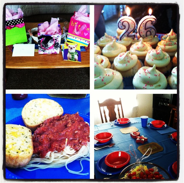 While most American’s are spending their Memorial Day at pool parties noshing on hamburgers and hotdogs fresh off the grill our family is enjoying a less traditional menu. We almost always have my family birthday dinner on Memorial Day and since it is my birthday I get to choose what we eat for dinner. I always request my mom make her spaghetti, it’s my favorite meal that no one can make better than my mama. There is nothing special about her spaghetti, she doesn’t even make her own sauce, but because it’s my mom’s spaghetti no one can touch a candle to it. ha ha. So we had a spaghetti dinner with vanilla cupcakes for dessert. In fact, we had vanilla cupcakes and Black Raspberry Chip Graeter’s Ice Cream… amazing!