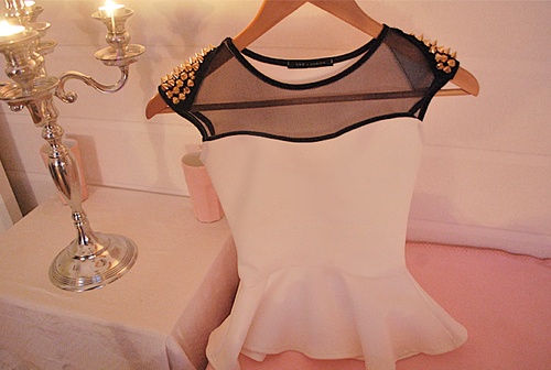 Do you ever find something online but you absolutely cannot find the original source anywhere and it just drives you mad?? Well, loves, I can relate. Yes, even the queen of Google cannot find the original source of this gorgeous blouse. And it is driving. me. crazy!! I have fallen in love with this sheer, studded, peplum top and I must have it/buy it/make it! Since I can’t for the life of me find out where this came from, it looks like this girl is going to be breaking out her sewing kit and studs…. to be continued….