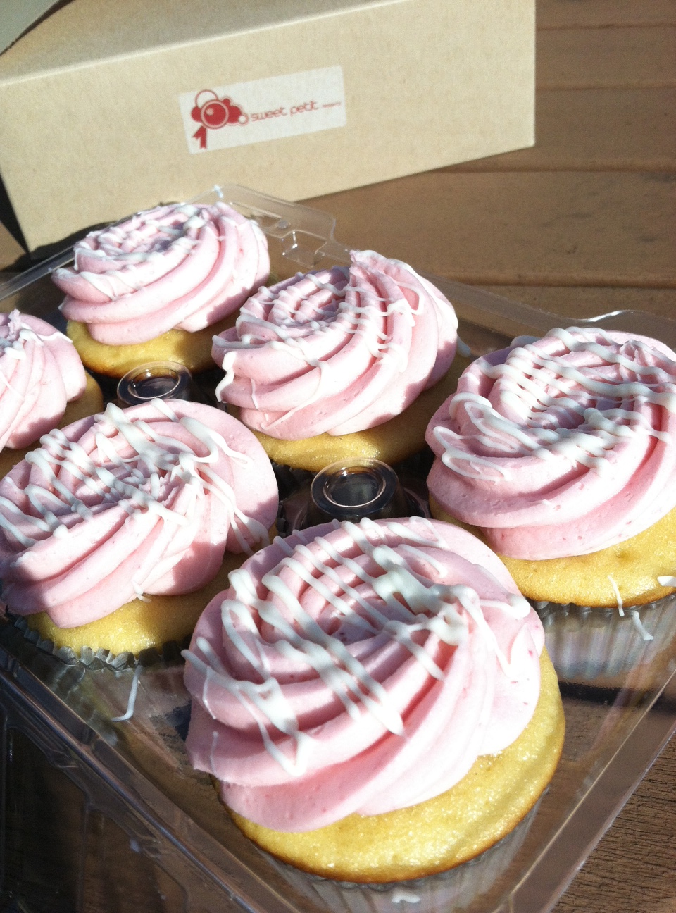 That’s right! I won these delicious goodies on Facebook! The Razzle Dazzle (white chocolate raspberry) cupcakes are from Royal Icing by Jillie and the gift box filled with tasty bite size delights is from Sweet Petit Desserts. Here’s a look inside!!