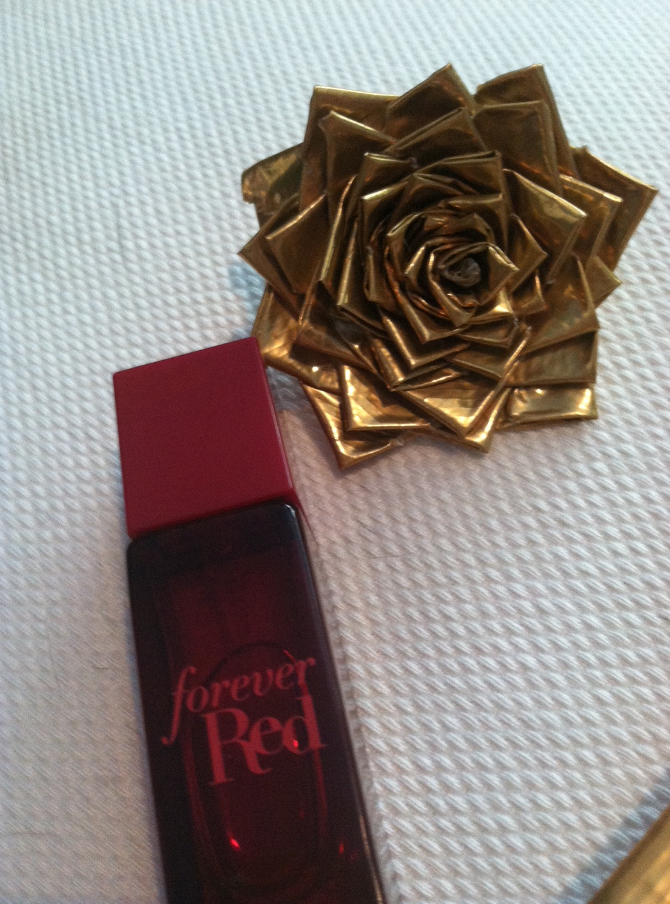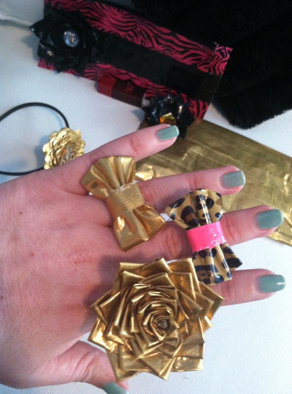 The other day I went over to one of my bestest friends Heather’s house and she just couldn’t wait any longer to give me my birthday presents… and I’m not one to turn down a present ha ha. She handmade the presents (well, except the wine and perfume) and they blew my mind with their awesomeness! She made me accessories made completely out of duct tape! Two clutches, the black and pink clutch zips and the gold folds over and secures with velcro; a golden rose headband, golden rose ring, golden bow ring and leopard print ring. I’m absolutely in love with everything and everything is so well made!! I told Heather she could sell this stuff it’s so good! Take a look at the photos below of everything…